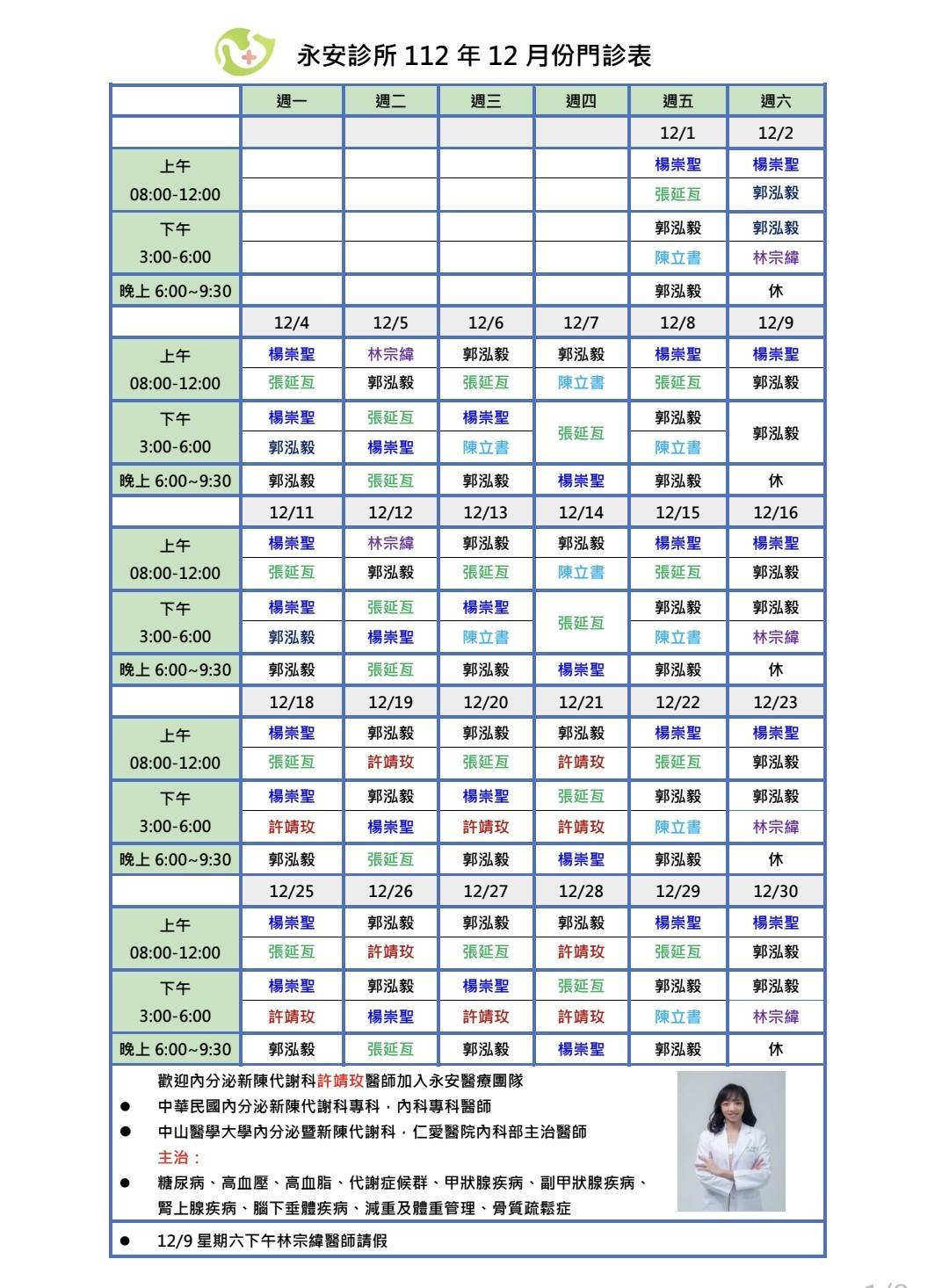 | 112年12月門診表